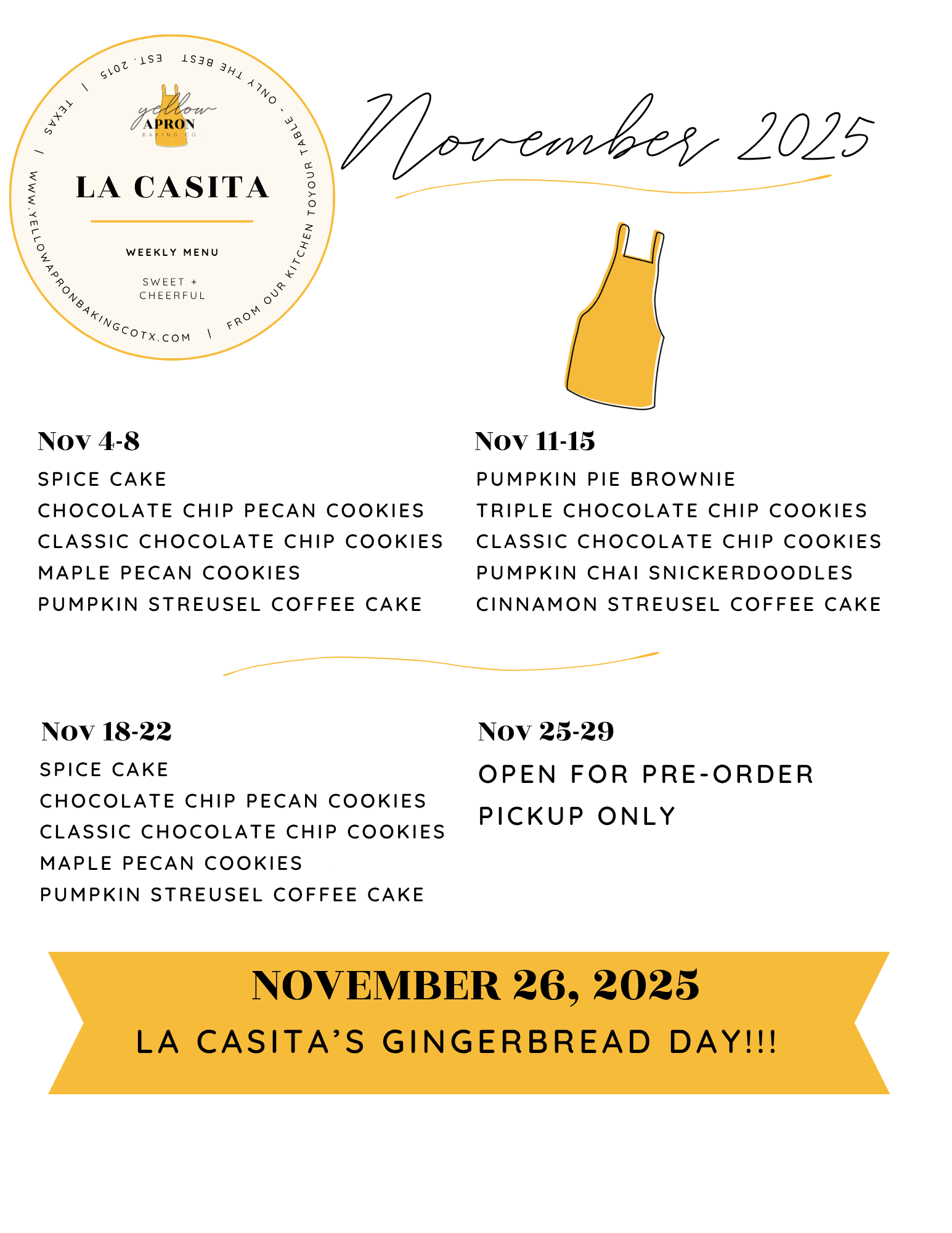 Each month, we whip up a small batch of our favorite treats—available daily in-store at La Casita. Think cozy classics, seasonal gems, and just-for-fun bakes, all made fresh and packed with love. Swing by, grab a treat (or two), and let a little Yellow Apron Baking Co. magic brighten your day.